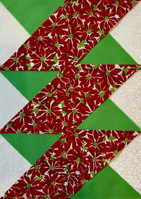 This new holiday table runner uses only 2 different sizes of triangles to create the twisty blocks in this quick to sew design.
